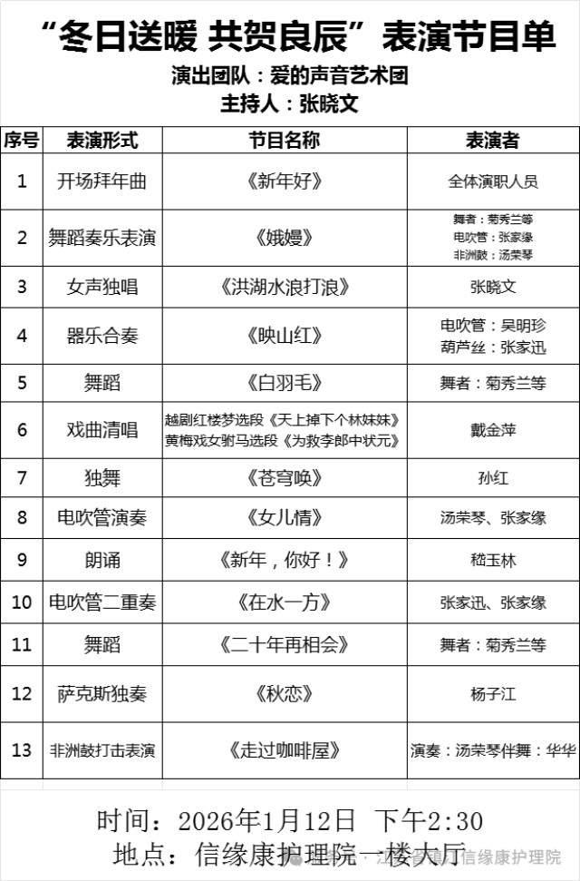 今天下午,在信缘康护理院一楼大厅里,一场主题为“冬日送暖 共贺良辰”的文艺演出温暖上演。